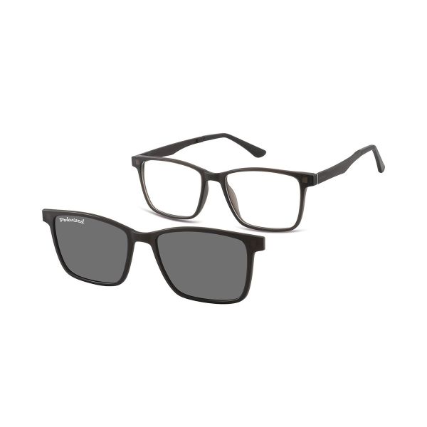 Full-plastic frame with crisp square lenses and a perfectly matching magnetic polarized clip-on.